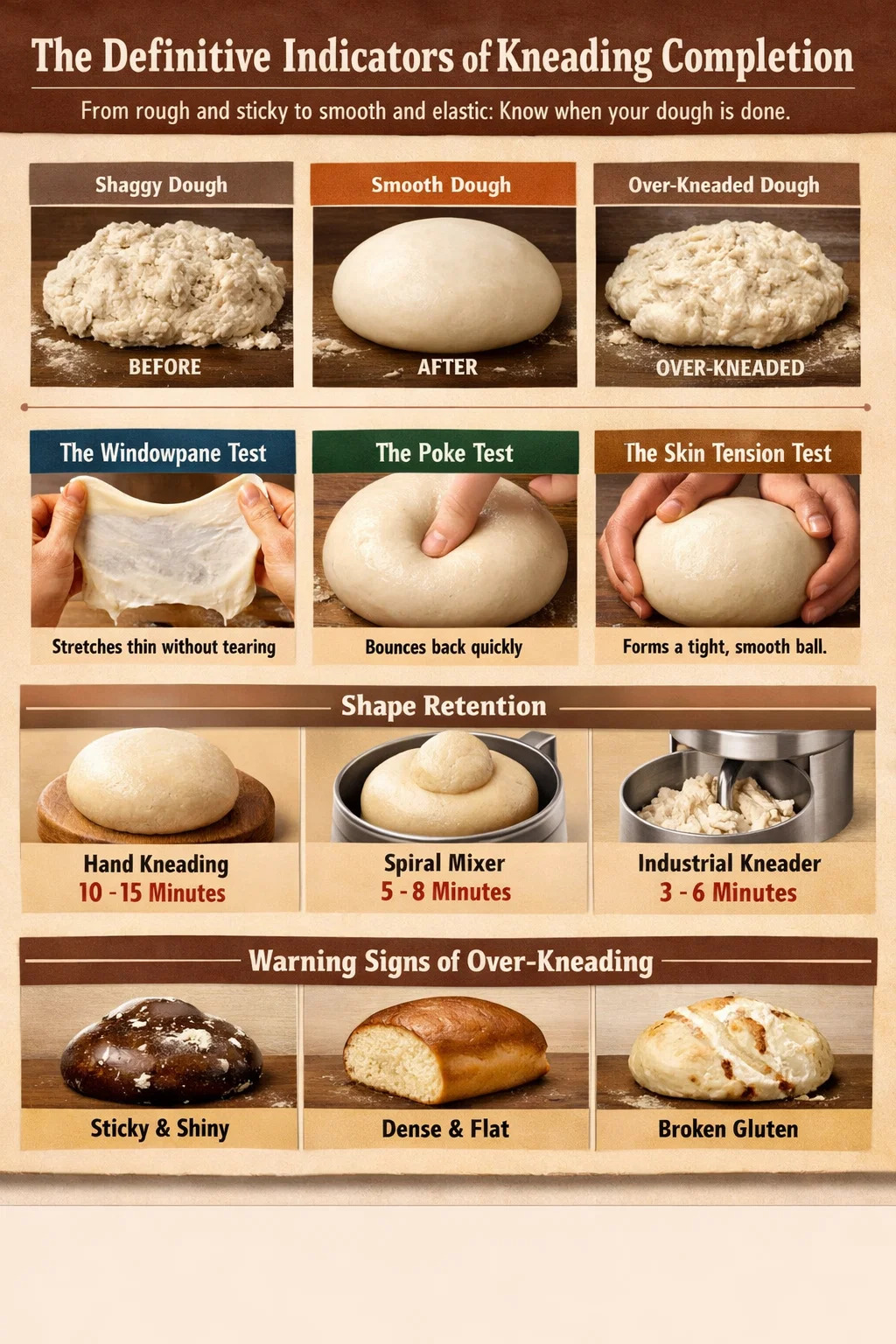 Вместо того, чтобы полагаться исключительно на таймер, который может быть неточным из-за влажности или содержания белка в муке, используйте эти физические тесты, чтобы проверить состояние вашего замешанный материал.