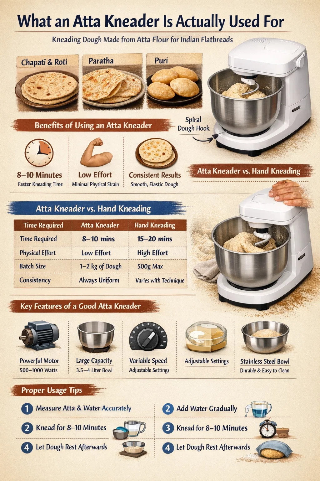 Атта-месильная машина — это кухонный прибор или приспособление, специально предназначенное для смешивания и замешивания теста из муки атта — цельнозерновой муки, используемой в качестве основы для индийских лепешек, таких как чапати, роти, паратха и пури. Машина повторяет движения складывания, сжатия и растягивания при ручном замешивании, развивая в тесте нити глютена, создавая мягкую, податливую текстуру, необходимую для лепешек, которые равномерно надуваются и остаются нежными после приготовления.